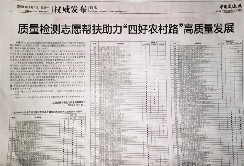 1月4日,中國交通報6版以《質(zhì)量檢測志愿幫扶助力“四好農(nóng)村路”高質(zhì)量發(fā)展》為題進(jìn)行報道。
