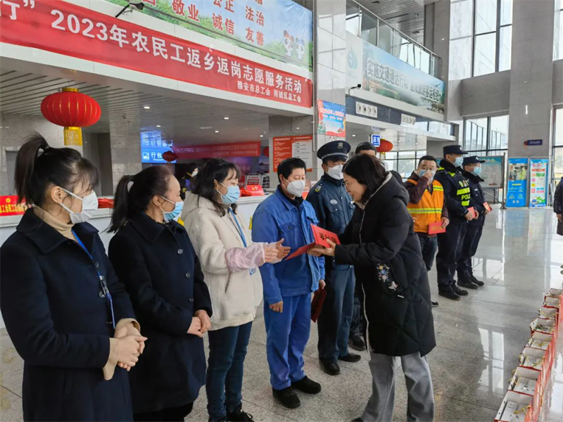 在雅安市汽車客運(yùn)站,李蓉調(diào)研了工會(huì)系統(tǒng)2023年農(nóng)民工返鄉(xiāng)返崗志愿服務(wù)活動(dòng)開展情況,看望慰問了民警、汽車客運(yùn)站職工、保安保潔等春運(yùn)一線人員,向大家致以新春祝福。李蓉要求,全市各級(jí)工會(huì)組織要統(tǒng)籌資源、精心組織,認(rèn)真做好送溫暖、農(nóng)民工返鄉(xiāng)返崗志愿服務(wù)活動(dòng)等工作,切實(shí)把黨和政府的關(guān)心關(guān)懷與工會(huì)組織的溫暖送到廣大職工群眾心坎上。