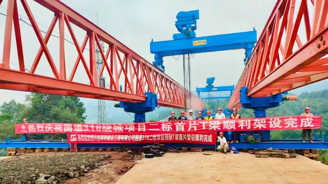 二道河大橋全橋長365.03米,全橋共計81片T梁。為確保首片T梁順利架設(shè),四川康藏路橋公司針對橋梁位于大縱坡、彎道段和T 梁運輸安全風險較大的實際,精心編制 T 梁架設(shè)專項施工方案,對施工流程、技術(shù)要求、安全措施等進行詳細規(guī)劃;對T梁預(yù)制場地和架設(shè)現(xiàn)場進行堅實、平整,滿足T梁運輸和架設(shè)設(shè)備的作業(yè)要求;對參與T梁架設(shè)的施工人員進行架梁設(shè)備操作、安全操作規(guī)程、質(zhì)量控制等專業(yè)培訓(xùn),組織技術(shù)人員對施工人員進行技術(shù)交底,詳細講解 T 梁架設(shè)的施工工藝、技術(shù)要求、安全注意事項等。同時,對橋梁墩臺進行精確測量,確定 T 梁的安裝位置和高程,為 T 梁架設(shè)提供準確的定位。T梁成功架設(shè),極大地鼓舞了施工熱情,為項目后續(xù)T梁架設(shè)積累了寶貴經(jīng)驗。