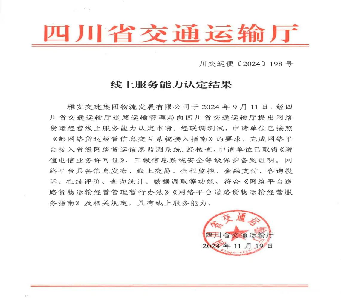 近日,《四川省交通運輸廳線上服務(wù)能力認(rèn)定結(jié)果》發(fā)布,雅安交建集團物流發(fā)展有限公司正式取得網(wǎng)絡(luò)貨運經(jīng)營線上服務(wù)能力認(rèn)定,標(biāo)志著雅安首家國企網(wǎng)絡(luò)貨運平臺即將面向市場運營。