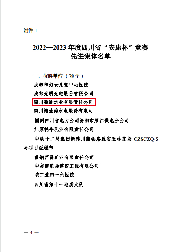 日前,省總工會(huì)、省應(yīng)急管理廳、省衛(wèi)健委聯(lián)合發(fā)文表?yè)P(yáng)2022-2023年度四川省“安康杯”競(jìng)賽先進(jìn)集體和先進(jìn)個(gè)人,蜀通公司被評(píng)為“優(yōu)勝單位”。