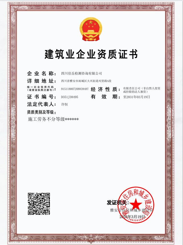 面對(duì)建筑檢測(cè)服務(wù)市場(chǎng)日趨激烈的競(jìng)爭(zhēng)態(tài)勢(shì)和業(yè)務(wù)結(jié)構(gòu)單一的瓶頸,佳岳公司堅(jiān)持以提質(zhì)升級(jí)為核心,主動(dòng)破局、向內(nèi)挖潛,將資質(zhì)提升作為增強(qiáng)核心競(jìng)爭(zhēng)力的關(guān)鍵突破口。3月19日,公司成功取得建筑業(yè)企業(yè)施工勞務(wù)資質(zhì)證書,標(biāo)志著公司具備承接各類施工勞務(wù)作業(yè)的法定資格,為拓展經(jīng)營(yíng)領(lǐng)域、完善業(yè)務(wù)鏈條注入新動(dòng)能。