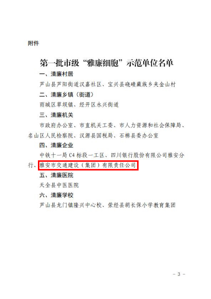 經(jīng)過雅安市黨風(fēng)廉政建設(shè)責(zé)任制領(lǐng)導(dǎo)小組辦公室嚴(yán)格考評審定,雅安市交通建設(shè)(集團(tuán))有限責(zé)任公司被命名為第一批市級“雅廉細(xì)胞”示范單位(清廉企業(yè))。