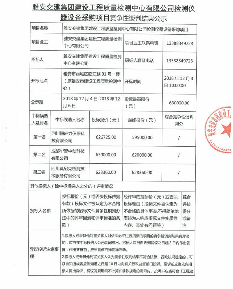 雅安交建集團建設工程質(zhì)量檢測中心有限公司檢測儀器設備采購項目競爭性談判結果公示