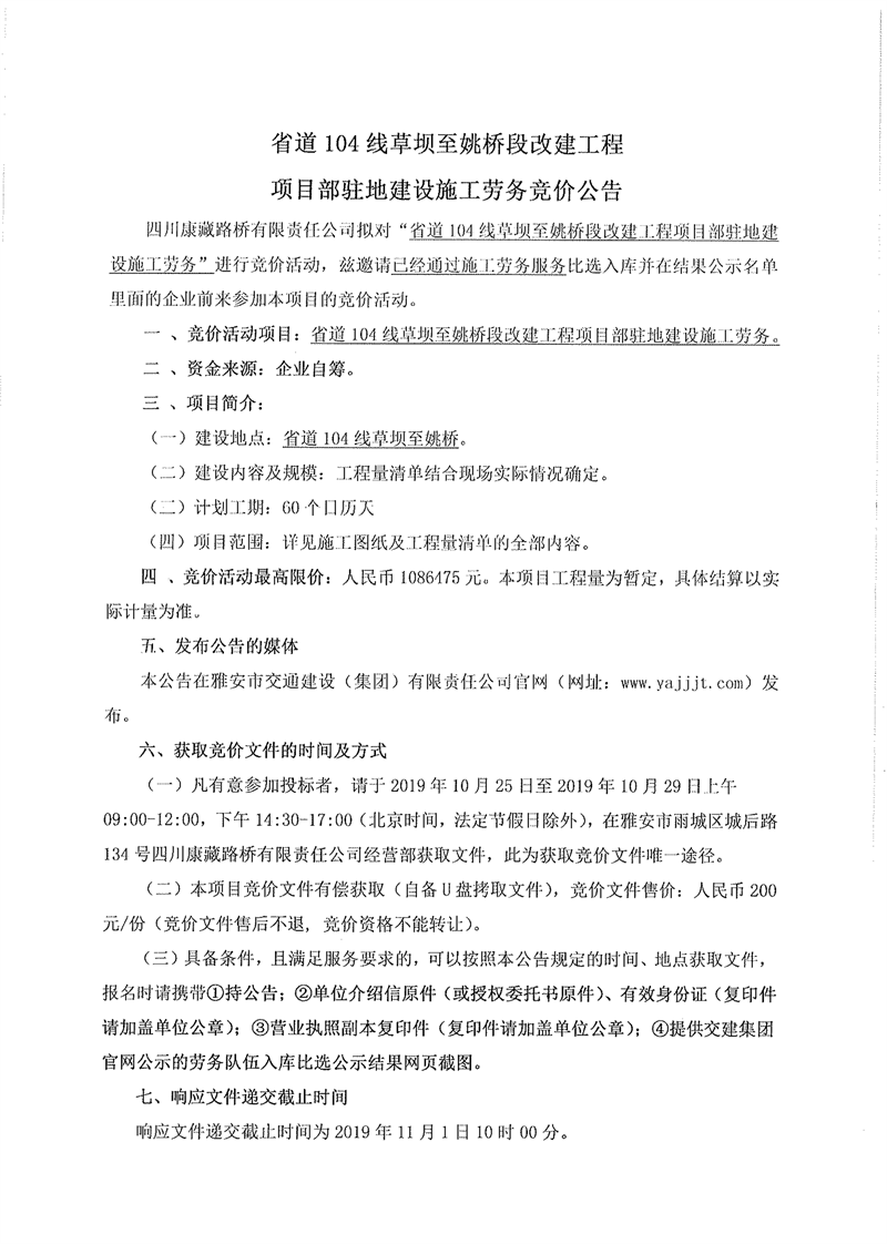 四川康藏路橋有限責任公司省道104線草壩至姚橋段改建工程項目部駐地建設(shè)施工勞務(wù)競價公告