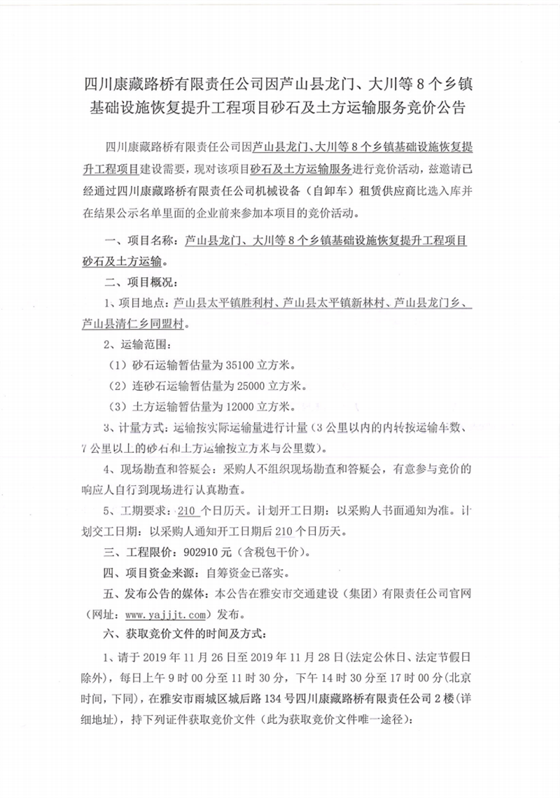 四川康藏路橋有限責(zé)任公司蘆山縣龍門(mén)、大川等8個(gè)鄉(xiāng)鎮(zhèn)基礎(chǔ)設(shè)施恢復(fù)提升工程項(xiàng)目砂石及土方運(yùn)輸服務(wù)競(jìng)價(jià)公告