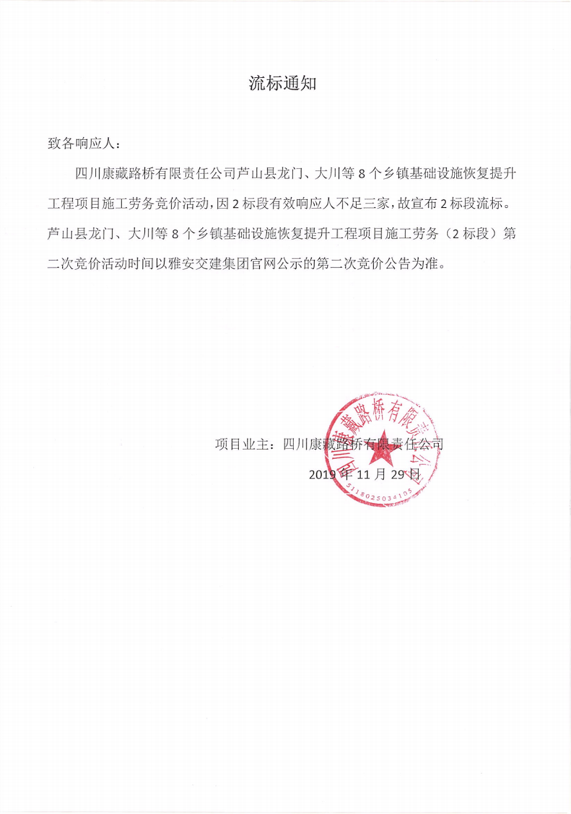 四川康藏路橋有限責(zé)任公司蘆山縣龍門、大川等8個(gè)鄉(xiāng)鎮(zhèn)基礎(chǔ)設(shè)施恢復(fù)提升工程項(xiàng)目施工勞務(wù)(2標(biāo)段)競(jìng)價(jià)流標(biāo)通知