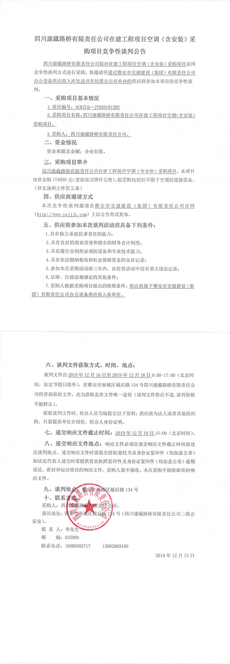 四川康藏路橋有限責(zé)任公司在建工程項(xiàng)目空調(diào)(含安裝)采購項(xiàng)目競爭性談判公告