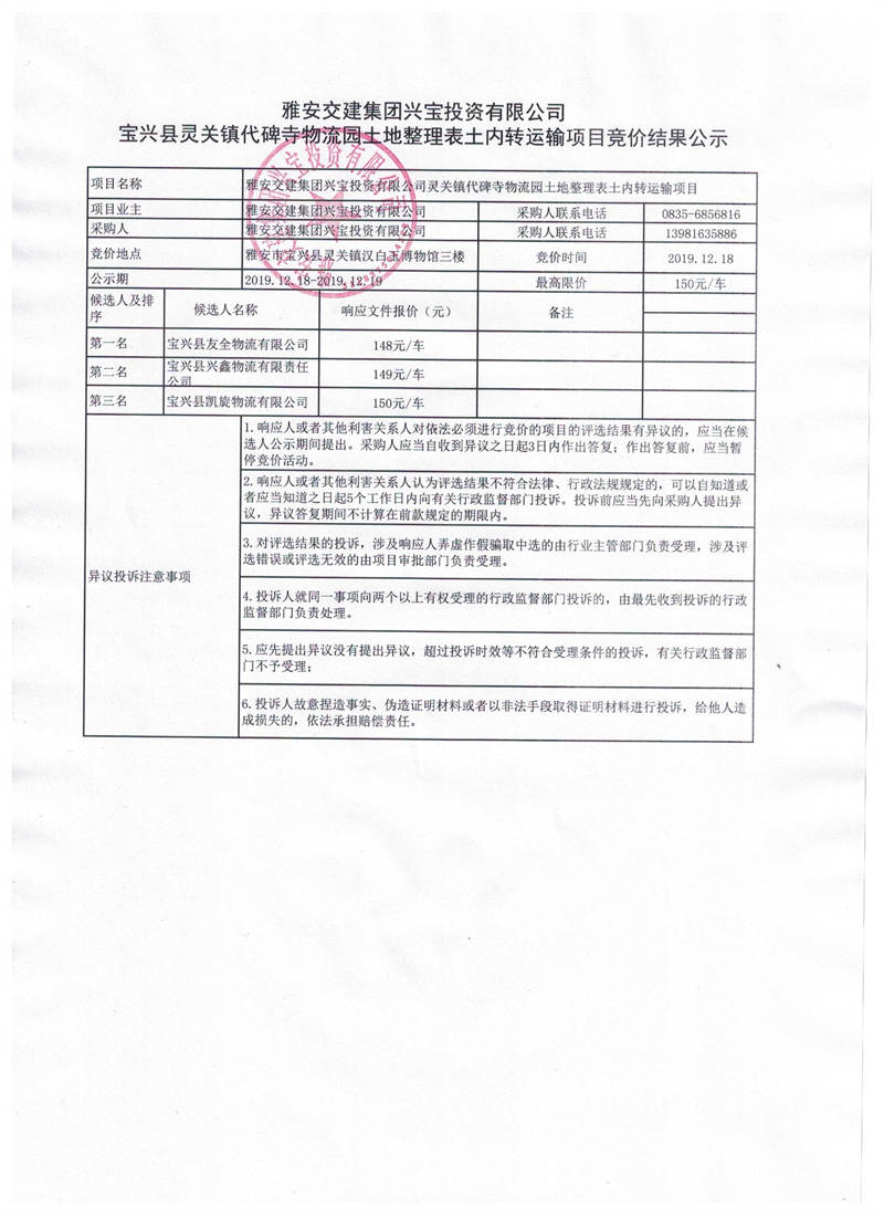 雅安交建集團興寶投資有限公司寶興縣靈關鎮(zhèn)代碑寺物流園土地整理表土內(nèi)轉(zhuǎn)運輸項目競價結(jié)果公示