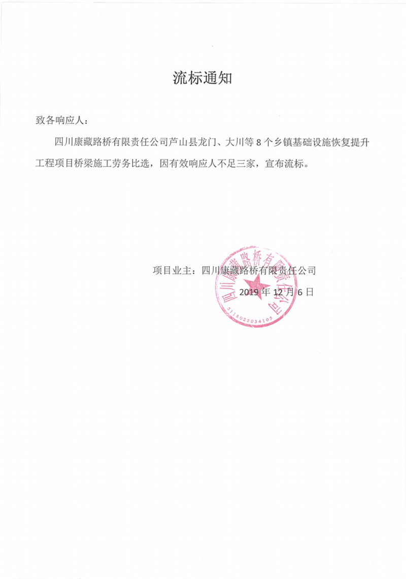 四川康藏路橋有限責(zé)任公司蘆山縣龍門、大川等8個鄉(xiāng)鎮(zhèn)基礎(chǔ)設(shè)施恢復(fù)提升工程項目橋梁施工勞務(wù)比選流標(biāo)通知