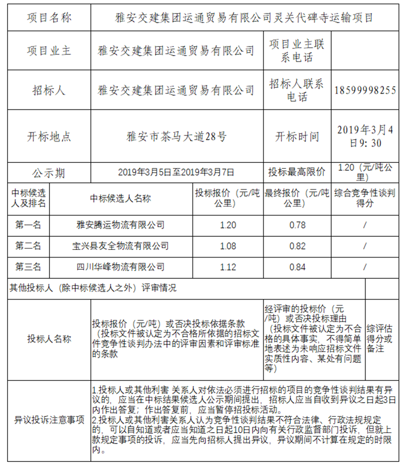 雅安交建集團運通貿(mào)易有限公司靈關代碑寺運輸項目競爭性談判結果公示