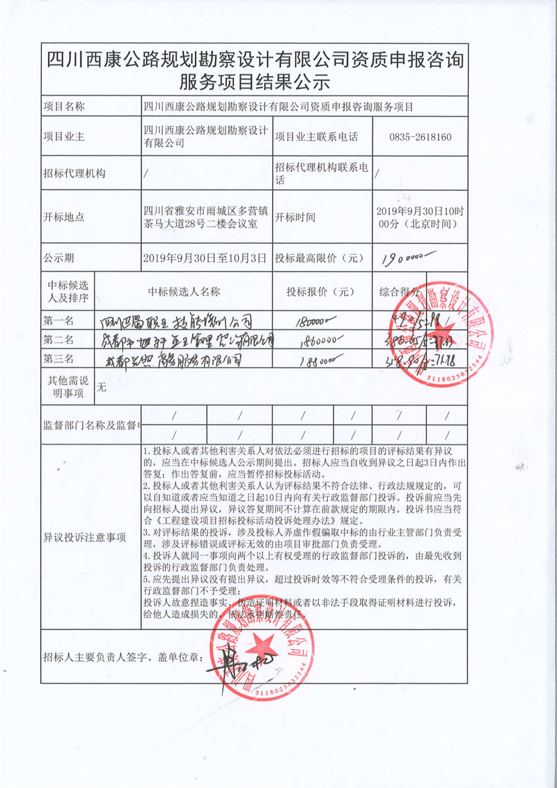 四川西康公路規(guī)劃勘察設計有限公司資質申報咨詢服務項目結果公示