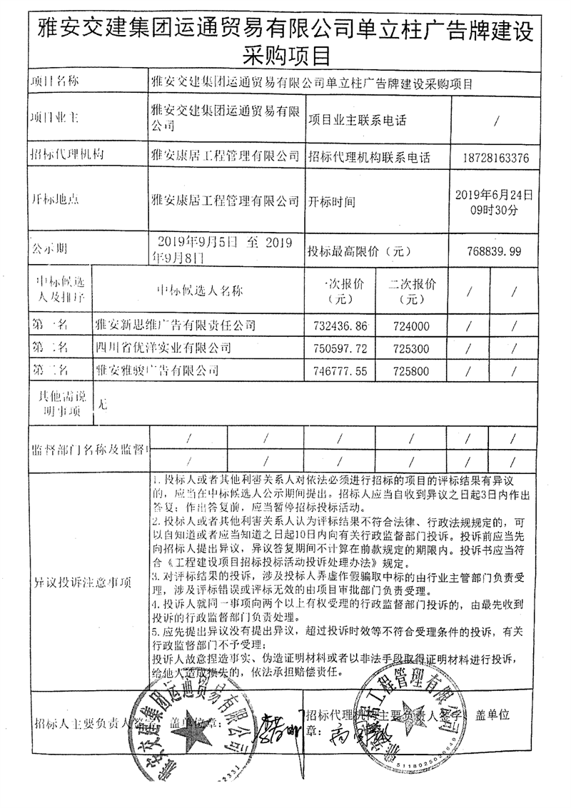 雅安交建集團(tuán)運(yùn)通貿(mào)易有限公司單立柱廣告牌建設(shè)采購(gòu)項(xiàng)目競(jìng)爭(zhēng)性談判結(jié)果公示