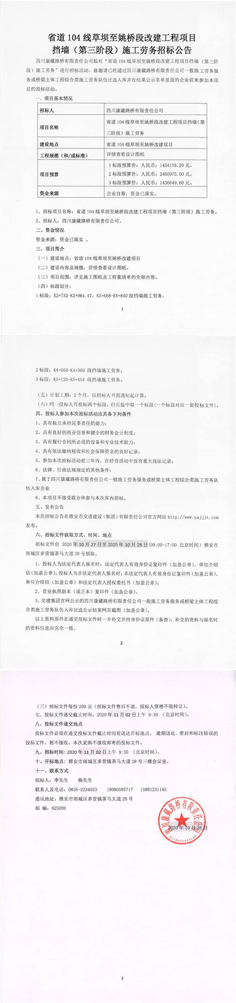 四川康藏路橋有限責(zé)任公司省道104線(xiàn)草壩至姚橋段改建工程項(xiàng)目擋墻(第三階段)施工勞務(wù)招標(biāo)公告