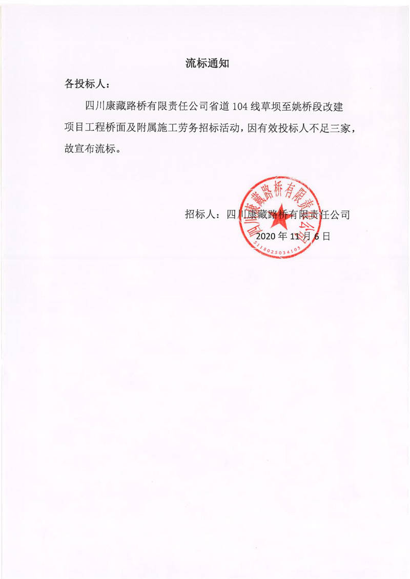 四川康藏路橋有限責(zé)任公司省道104線草壩至姚橋段改建項(xiàng)目工程橋面及附屬施工勞務(wù)流標(biāo)通知