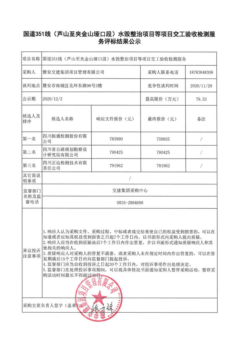 雅安交建集團項目管理有限公司國道351線(蘆山至夾金山埡口段)水毀整治項目等項目交工驗收檢測服務評標結果公示