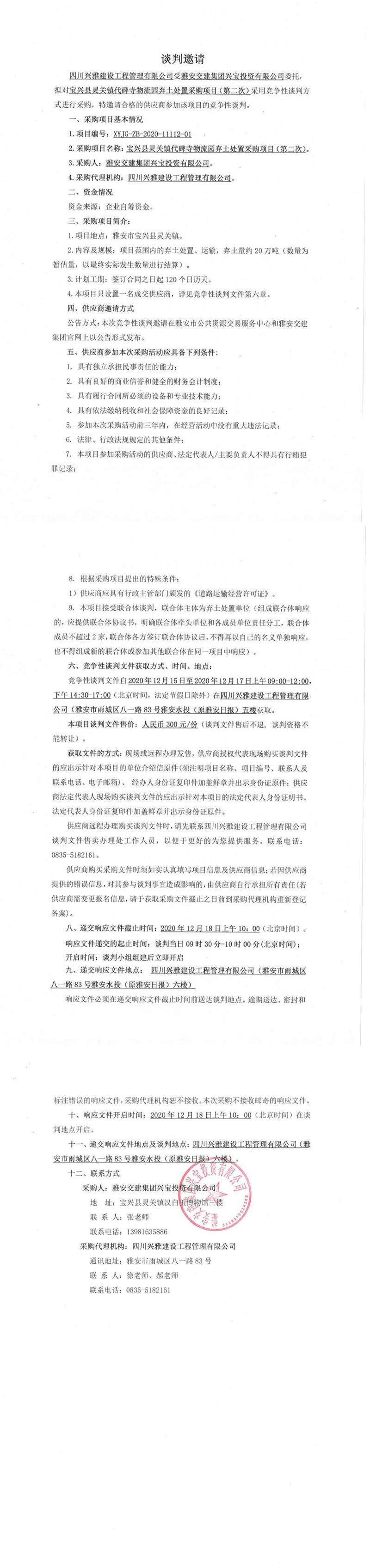 雅安交建集團(tuán)興寶投資有限公司寶興縣靈關(guān)鎮(zhèn)代碑寺物流園棄土處置采購項目(第二次)談判公告
