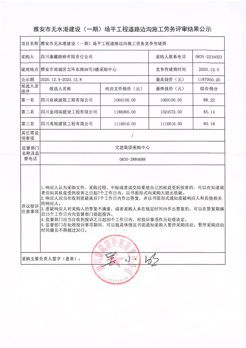 四川康藏路橋有限責任公司雅安市無水港建設(shè)(一期)場平工程道路邊溝施工勞務(wù)評審結(jié)果公示