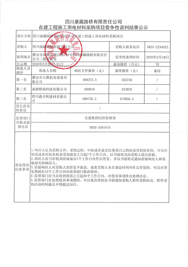 四川康藏路橋有限責(zé)任公司在建工程施工用電材料采購項(xiàng)目競爭性談判結(jié)果公示