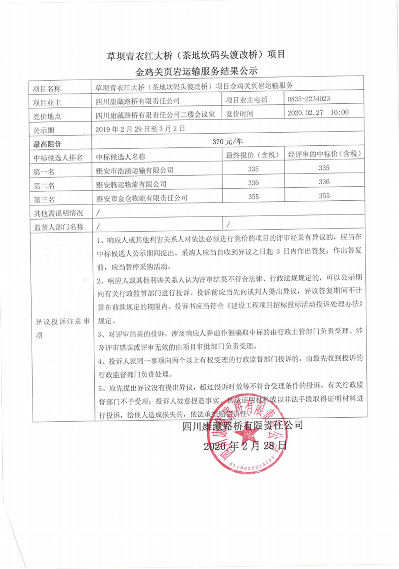 四川康藏路橋有限責(zé)任公司草壩青衣江大橋(茶地坎碼頭渡改橋)項(xiàng)目金雞關(guān)頁巖運(yùn)輸服務(wù)結(jié)果公示