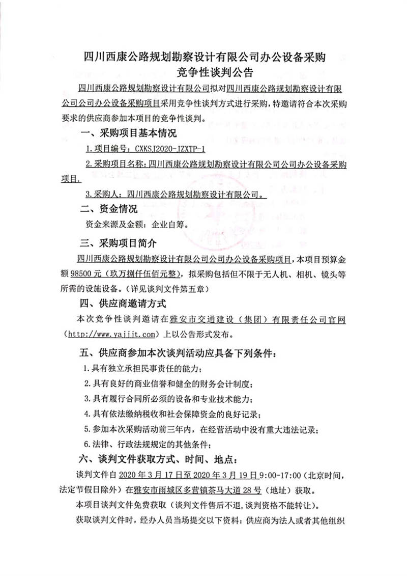 四川西康公路規(guī)劃勘察設(shè)計(jì)有限公司辦公設(shè)備采購競爭性談判公告