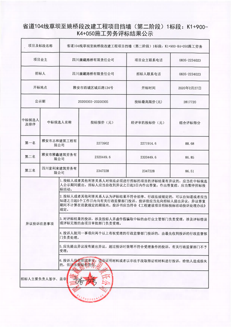 四川康藏路橋有限責(zé)任公司省道104線草壩至姚橋段改建工程項目擋墻(第二階段)1標段:K1+900-K4+050施工勞務(wù)評標結(jié)果公示