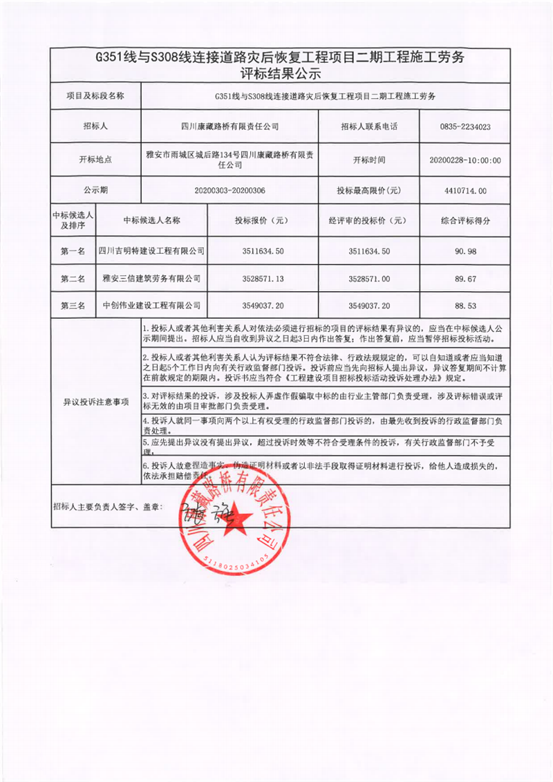 四川康藏路橋有限責(zé)任公司G351線與S308線連接道路災(zāi)后恢復(fù)工程項(xiàng)目二期工程施工勞務(wù)評(píng)標(biāo)結(jié)果公示