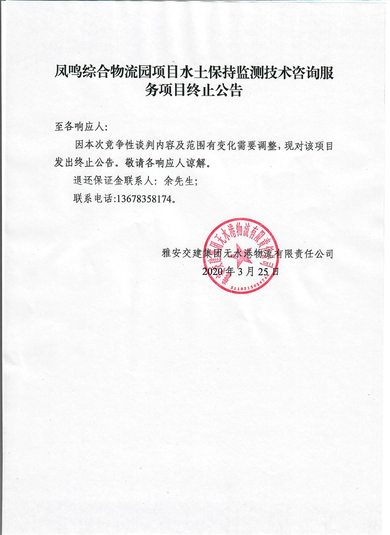 雅安交建集團(tuán)無水港物流有限責(zé)任公司鳳鳴綜合物流園項(xiàng)目水土保持監(jiān)測技術(shù)咨詢服務(wù)項(xiàng)目終止公告