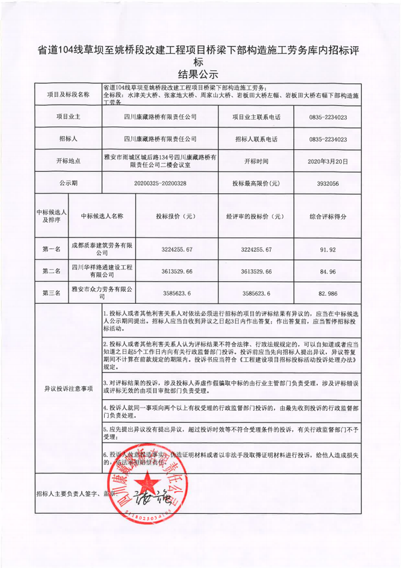 四川康藏路橋有限責(zé)任公司省道104線草壩至姚橋段改建工程項目橋梁下部構(gòu)造施工勞務(wù)評標(biāo)結(jié)果公示