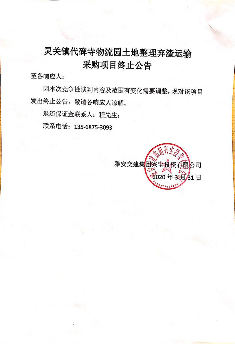 雅安交建集團(tuán)興寶投資有限公司靈關(guān)鎮(zhèn)代碑寺物流園土地整理?xiàng)壴\(yùn)輸采購項(xiàng)目終止公告