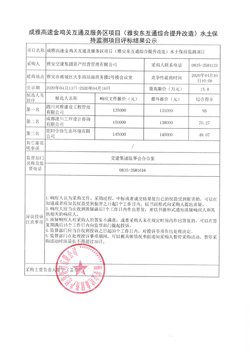 雅安交建集團(tuán)資產(chǎn)經(jīng)營管理有限公司成雅高速金雞關(guān)互通及服務(wù)區(qū)項(xiàng)目(雅安東互通綜合提升改造)水土保持監(jiān)測項(xiàng)目評標(biāo)結(jié)果公示
