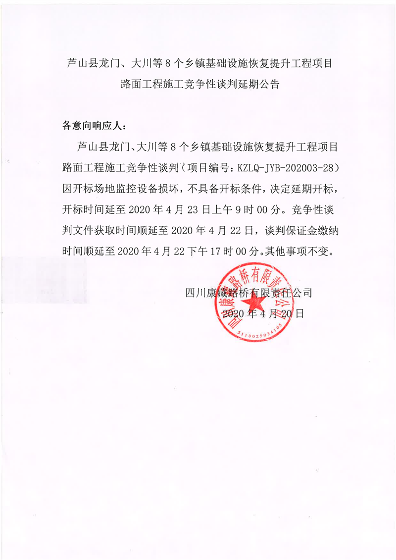 四川康藏路橋有限責任公司蘆山縣龍門、大川等8個鄉(xiāng)鎮(zhèn)基礎(chǔ)設(shè)施恢復提升工程項目路面工程施工競爭性談判延期公告