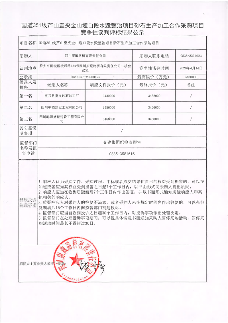 四川康藏路橋有限責(zé)任公司國道351線蘆山至夾金山埡口段水毀整治項目砂石生產(chǎn)加工合作采購項目競爭性談判評標結(jié)果公示