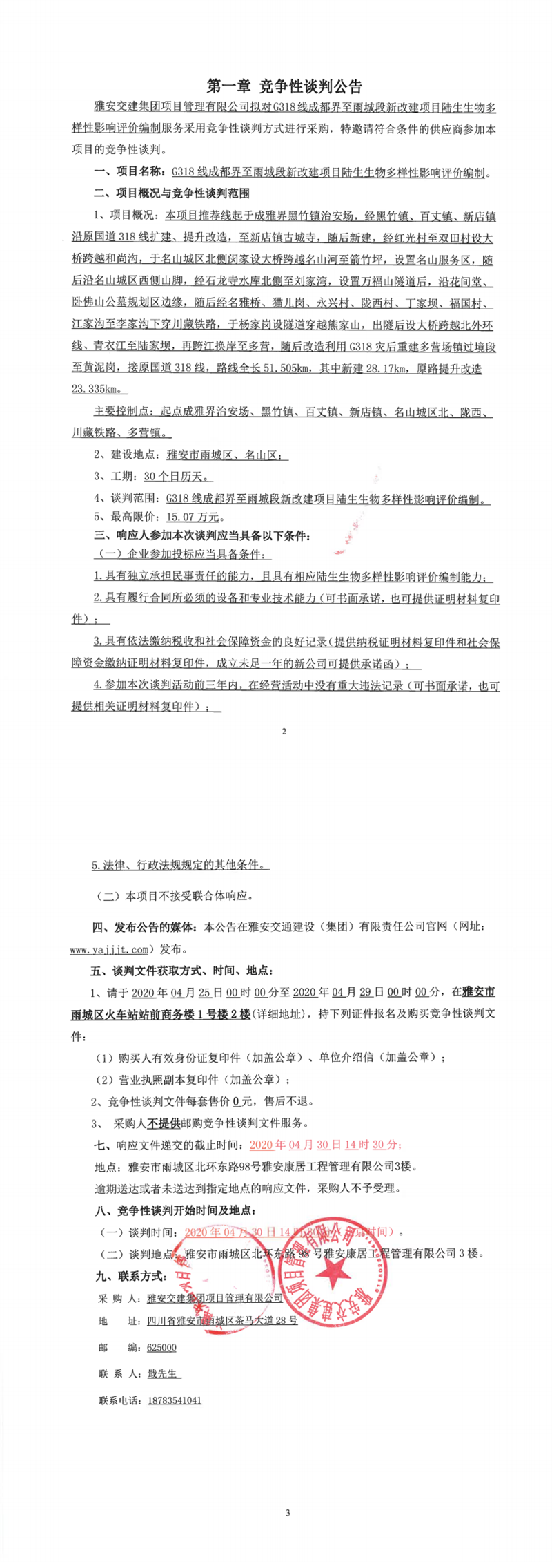 雅安交建集團項目管理有限公司G318線成都界至雨城段新改建項目陸生生物多樣性影響評價編制競爭性談判公告