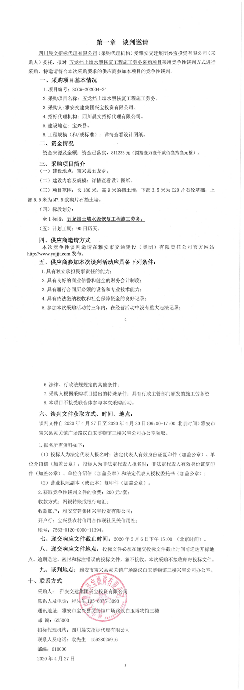 雅安交建集團(tuán)興寶投資有限公司五龍擋土墻水毀恢復(fù)工程施工勞務(wù)采購(gòu)項(xiàng)目競(jìng)爭(zhēng)性談判公告