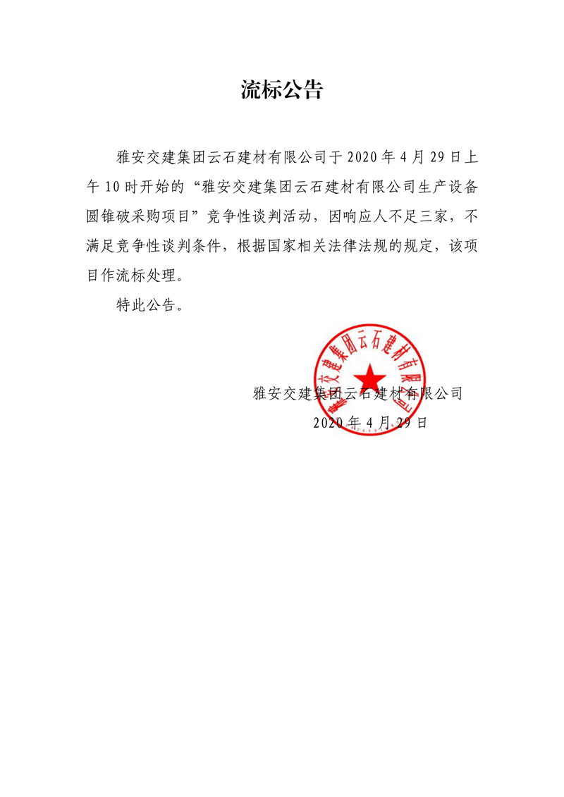 雅安交建集團(tuán)云石建材有限公司生產(chǎn)設(shè)備圓錐破采購項(xiàng)目流標(biāo)公告