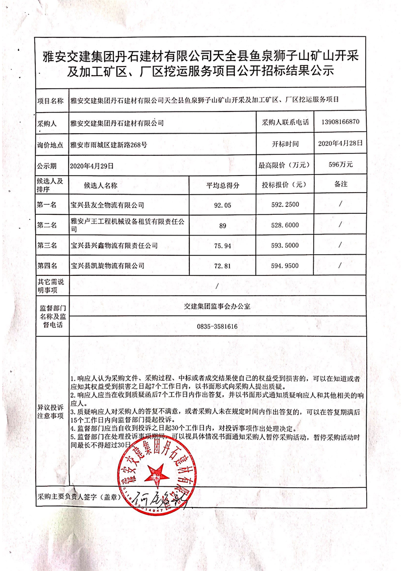 雅安交建集團丹石建材有限公司天全縣魚泉獅子山礦山開采及加工礦區(qū)、廠區(qū)挖運服務(wù)項目公開招標(biāo)結(jié)果公示