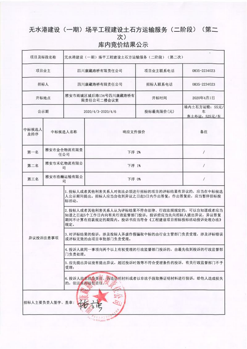 四川康藏路橋有限責任公司無水港建設(一期)場平工程土石方運輸服務(二階段)(第二次)庫內(nèi)競價結果公示