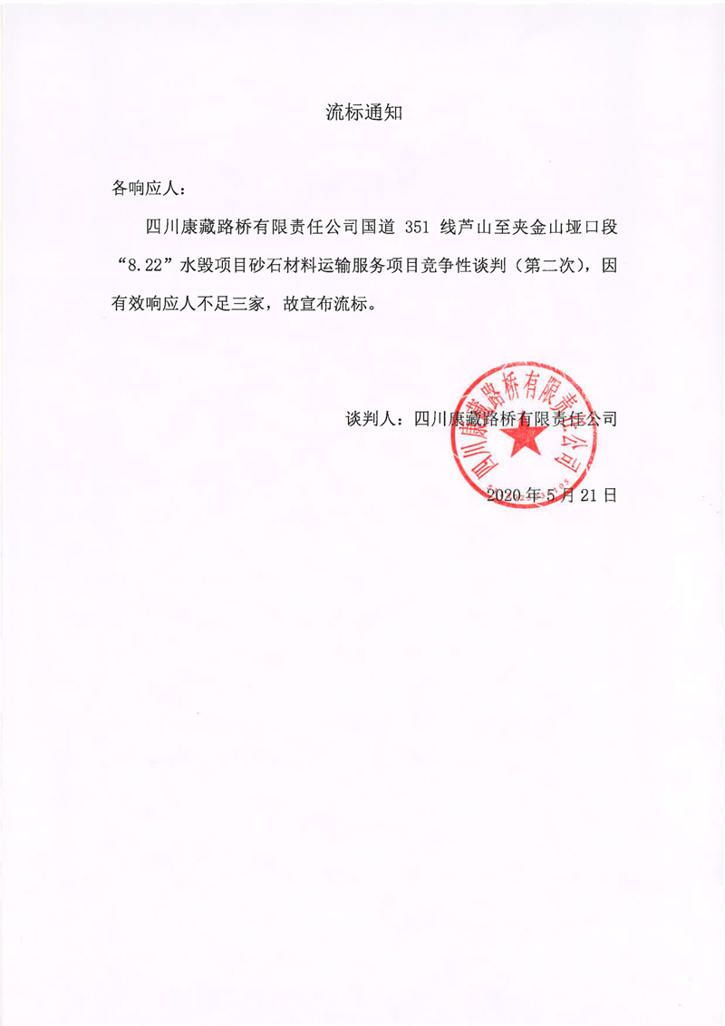四川康藏路橋有限責(zé)任公司國道351線蘆山至夾金山埡口段8.22水毀項(xiàng)目砂石材料運(yùn)輸服務(wù)項(xiàng)目(第二次)流標(biāo)通知