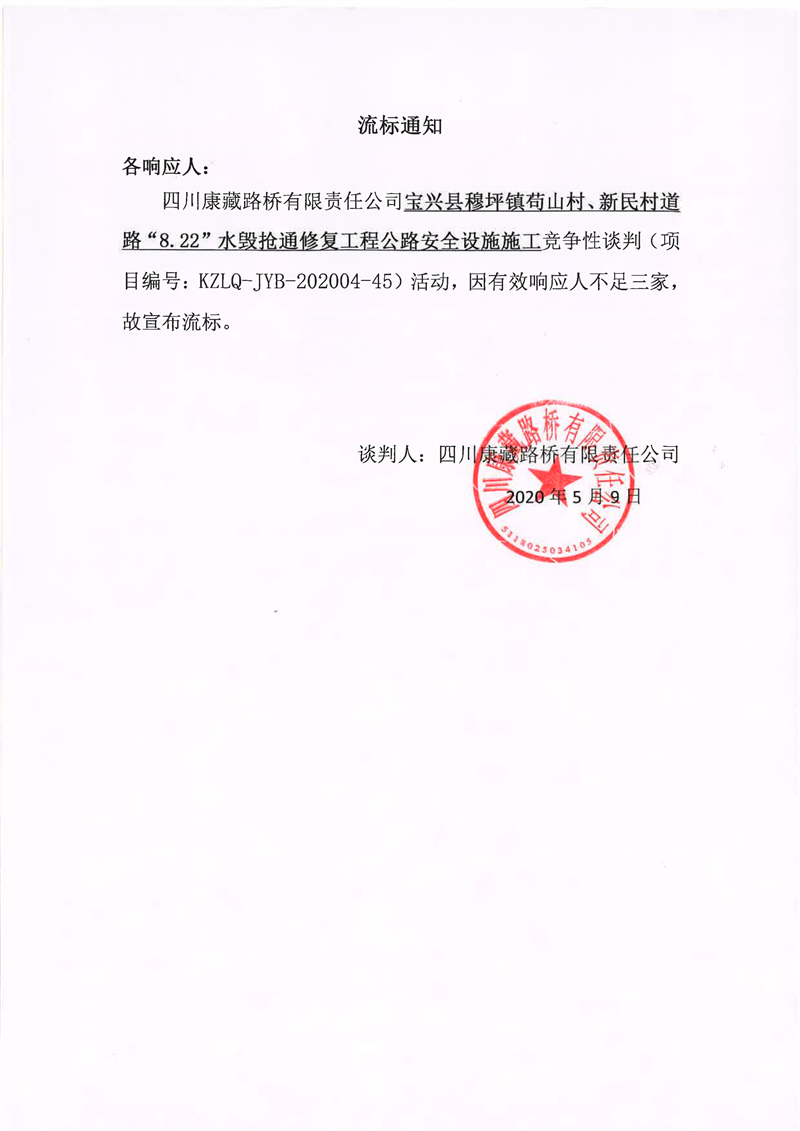 四川康藏路橋有限責任公司寶興縣穆坪鎮(zhèn)茍山村、新民村道路“8.22”水毀搶通修復工程公路安全設施施工競爭性談判流標通知
