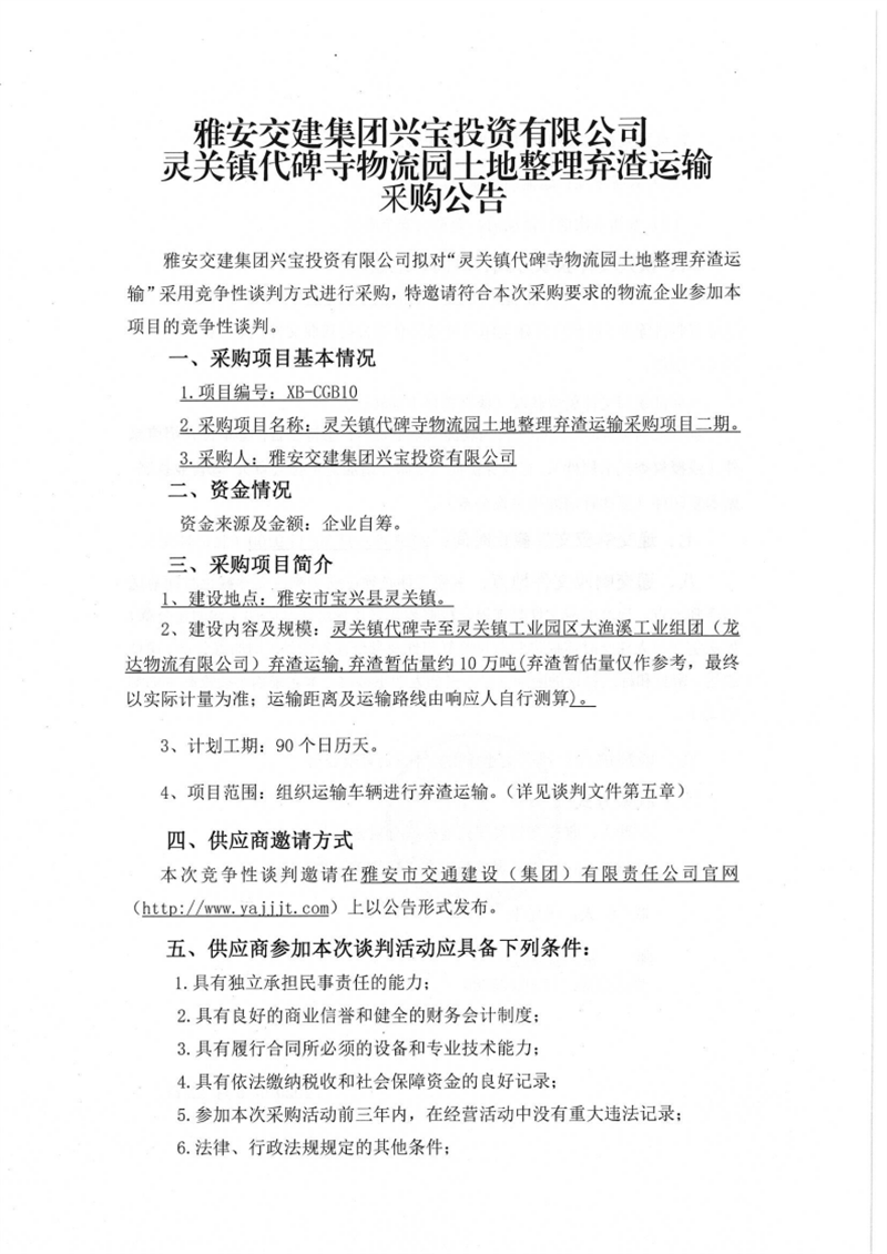 雅安交建集團興寶投資有限公司靈關鎮(zhèn)代碑寺物流園土地整理棄渣運輸采購項目二期競爭性談判公告