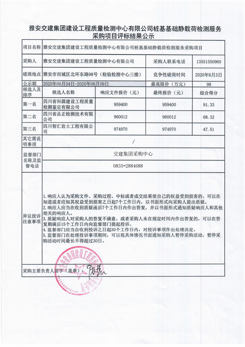 雅安交建集團建設(shè)工程質(zhì)量檢測中心有限公司樁基基礎(chǔ)靜載荷檢測服務(wù)采購項目評標結(jié)果公示