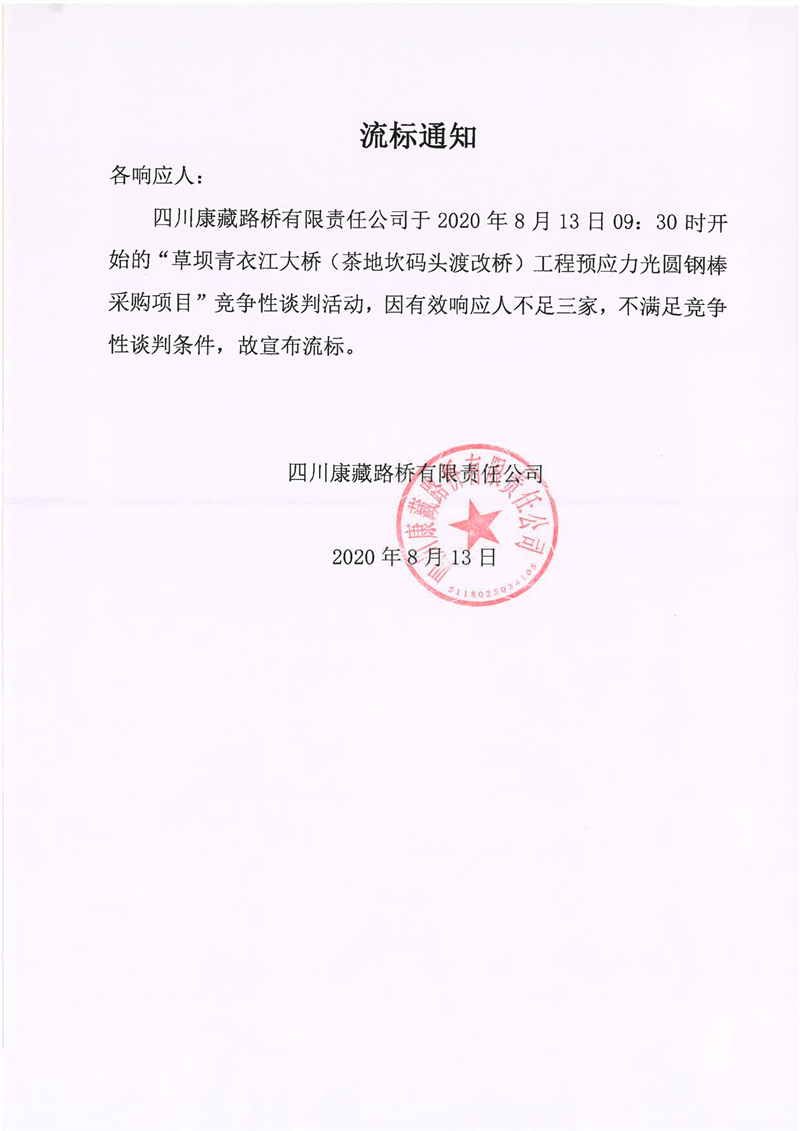四川康藏路橋有限責任公司草壩青衣江大橋(茶地坎碼頭渡改橋)工程預應(yīng)力光圓鋼棒采購項目流標通知
