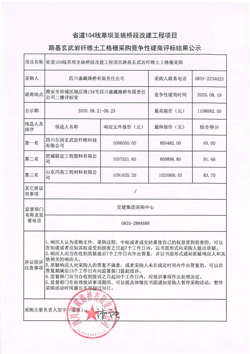 四川康藏路橋有限責(zé)任公司省道104線草壩至姚橋段改建工程項目路基玄武巖纖維土工格柵采購競爭性磋商評標結(jié)果公示