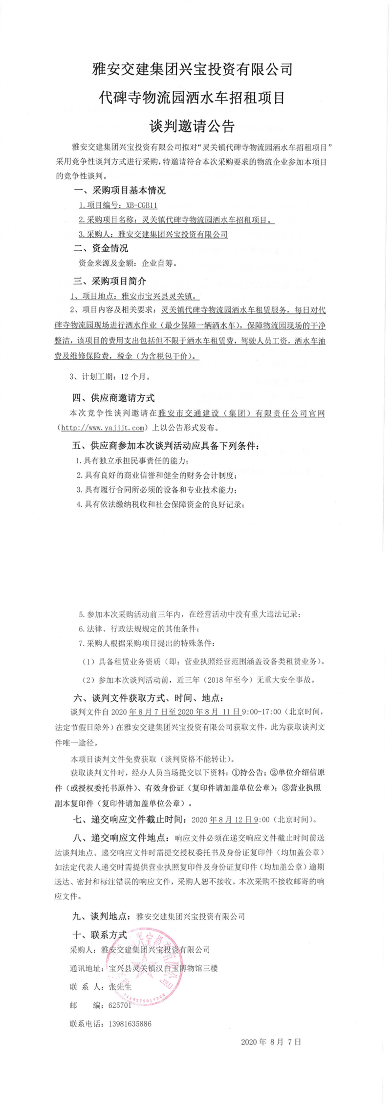 雅安交建集團(tuán)興寶投資有限公司代碑寺物流園灑水車招租項(xiàng)目談判邀請(qǐng)公告
