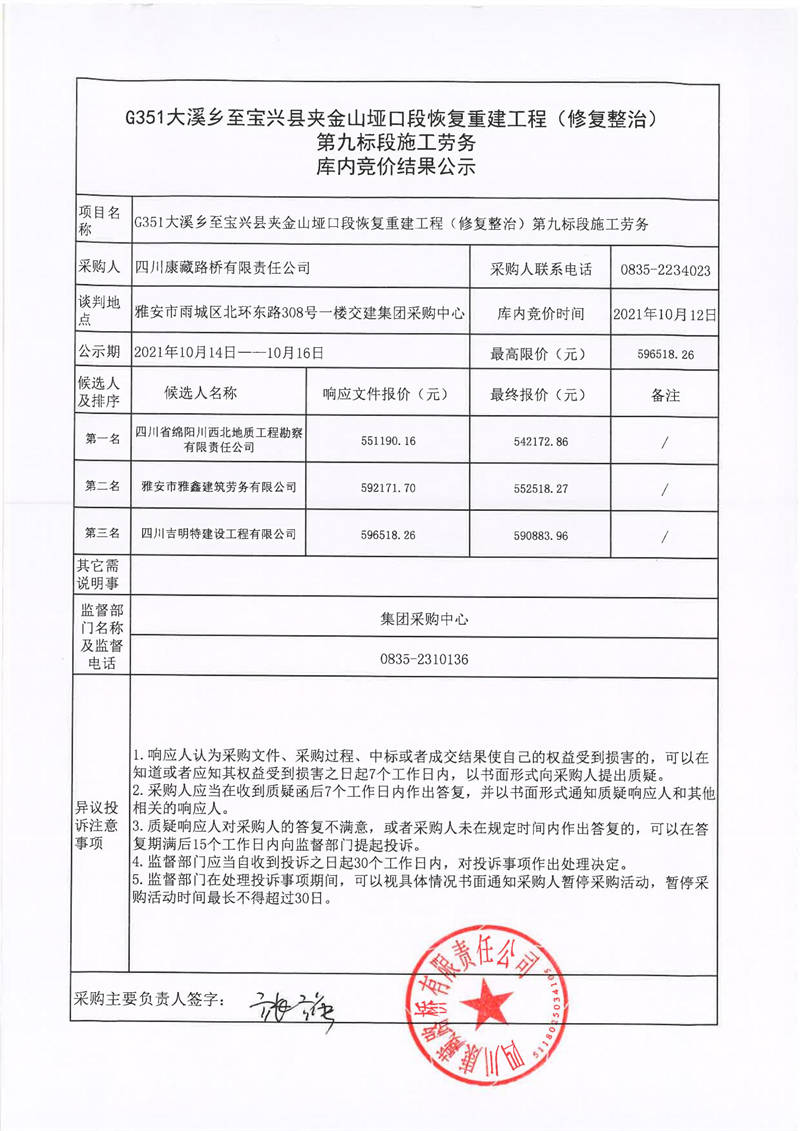 四川康藏路橋有限責任公司G351大溪鄉(xiāng)至寶興縣夾金山埡口段恢復(fù)重建工程(修復(fù)整治)第九標段施工勞務(wù)庫內(nèi)競價結(jié)果公示
