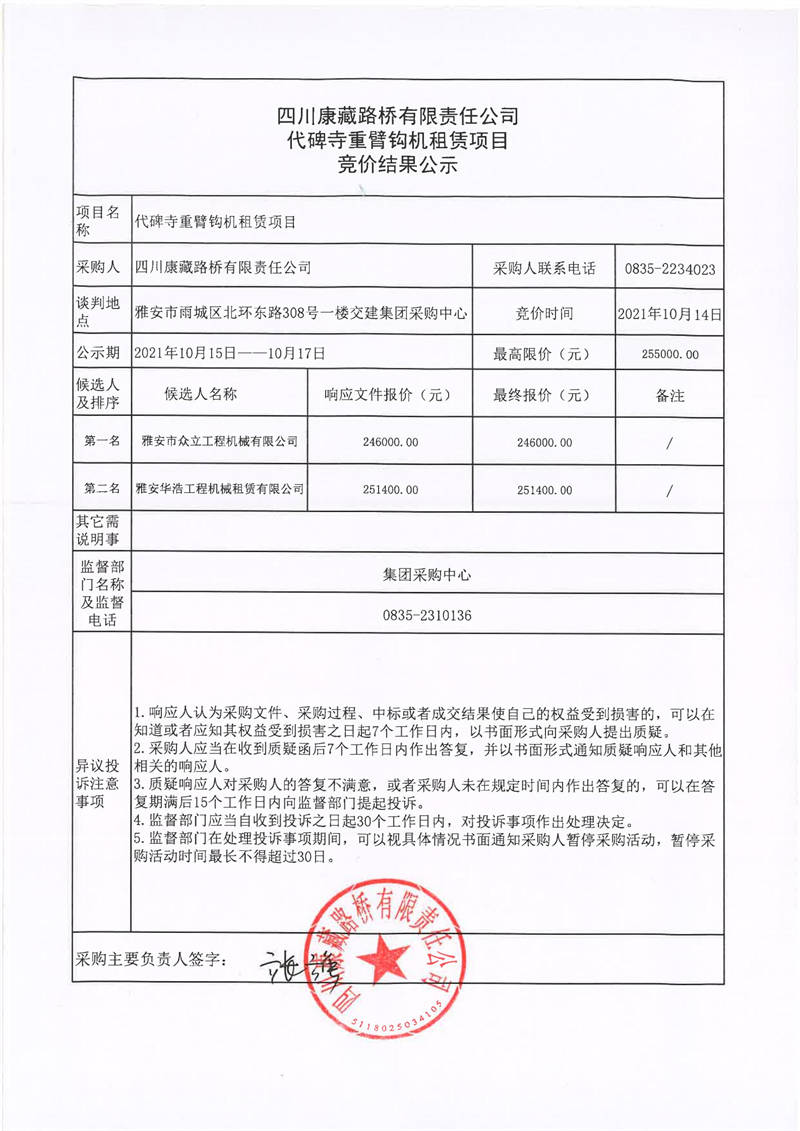 四川康藏路橋有限責任公司代碑寺重臂鉤機租賃項目競價結(jié)果公示