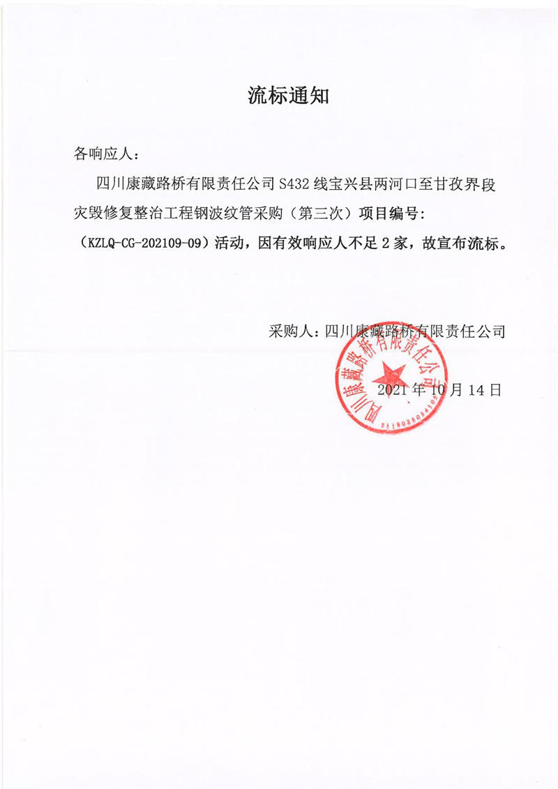 四川康藏路橋有限責(zé)任公司S432線寶興縣兩河口至甘孜界段災(zāi)毀修復(fù)整治工程鋼波紋管采購(gòu)(第三次)競(jìng)價(jià)公告