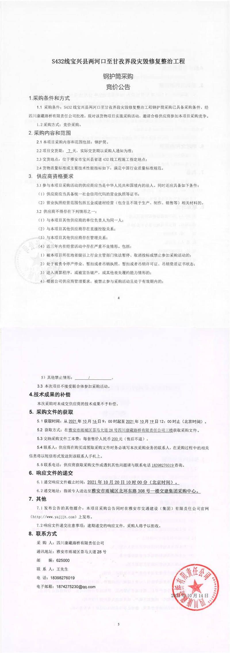 四川康藏路橋有限責(zé)任公司S432線寶興縣兩河口至甘孜界段災(zāi)毀修復(fù)整治工程鋼護(hù)筒采購競價(jià)公告