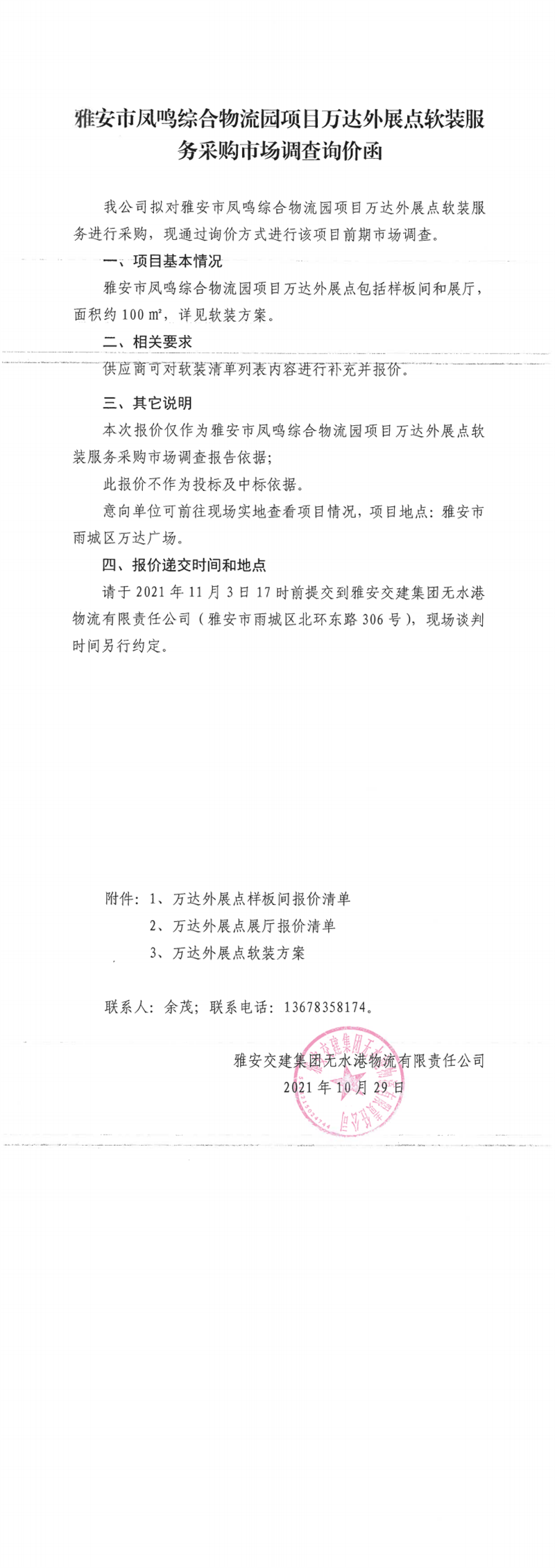 雅安交建集團(tuán)無(wú)水港物流有限責(zé)任公司雅安市鳳鳴綜合物流園項(xiàng)目萬(wàn)達(dá)外展點(diǎn)軟裝服務(wù)采購(gòu)市場(chǎng)調(diào)查詢價(jià)函